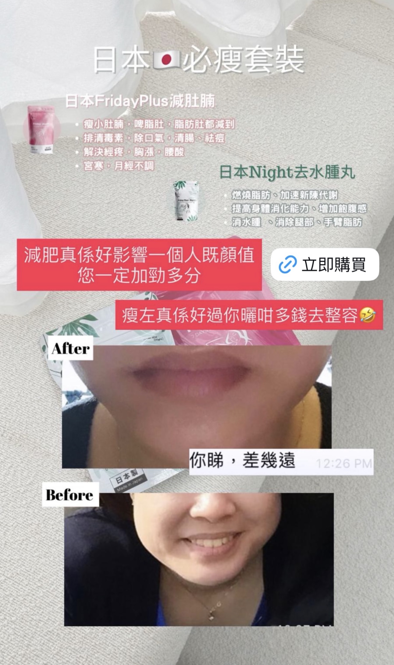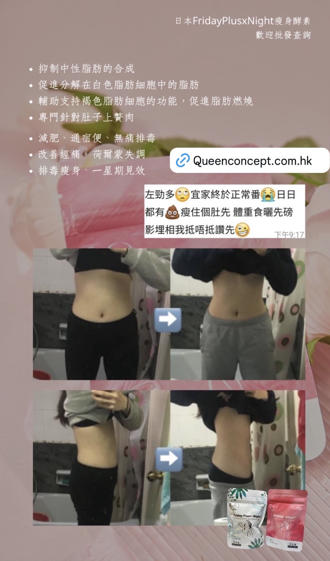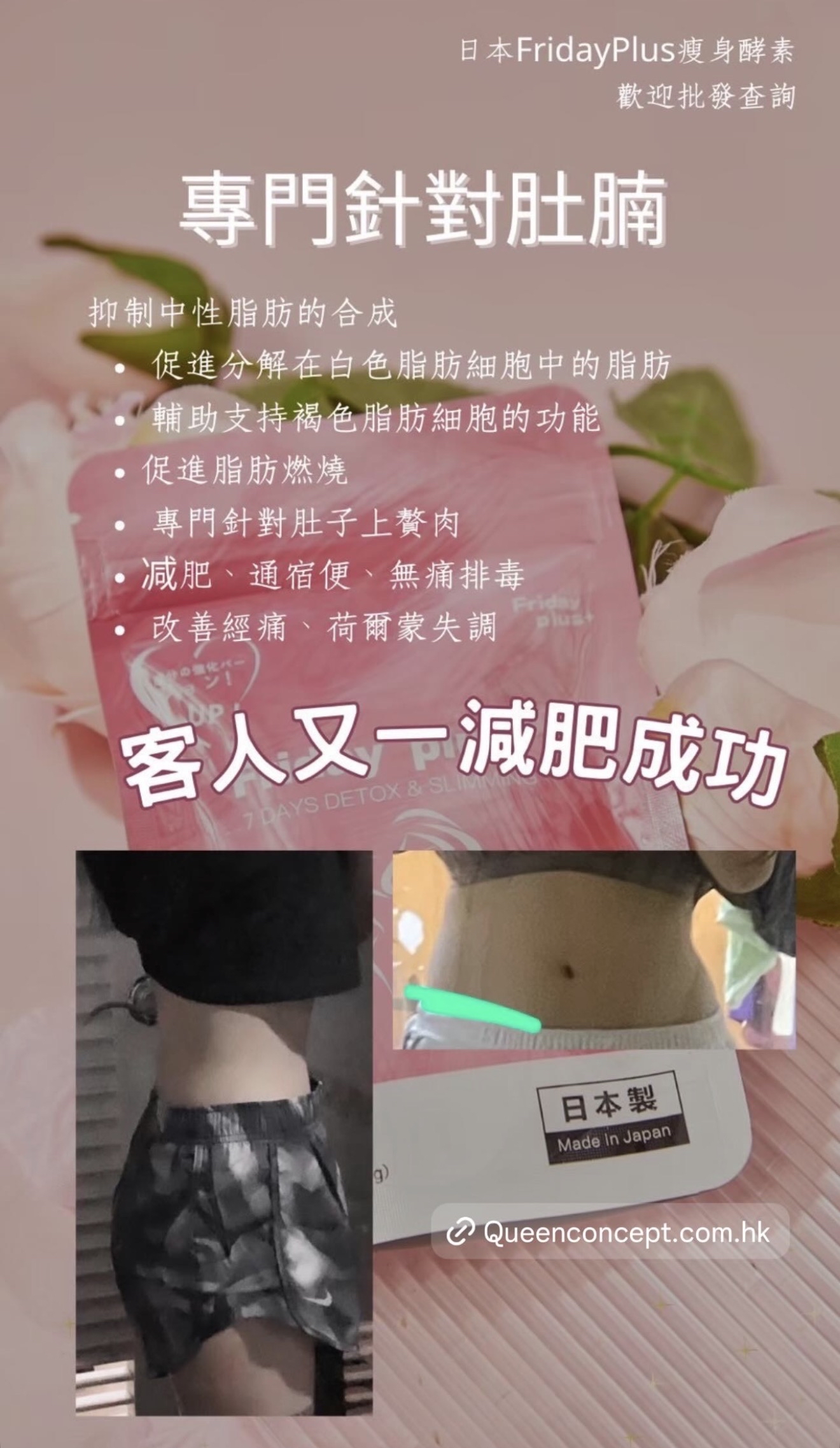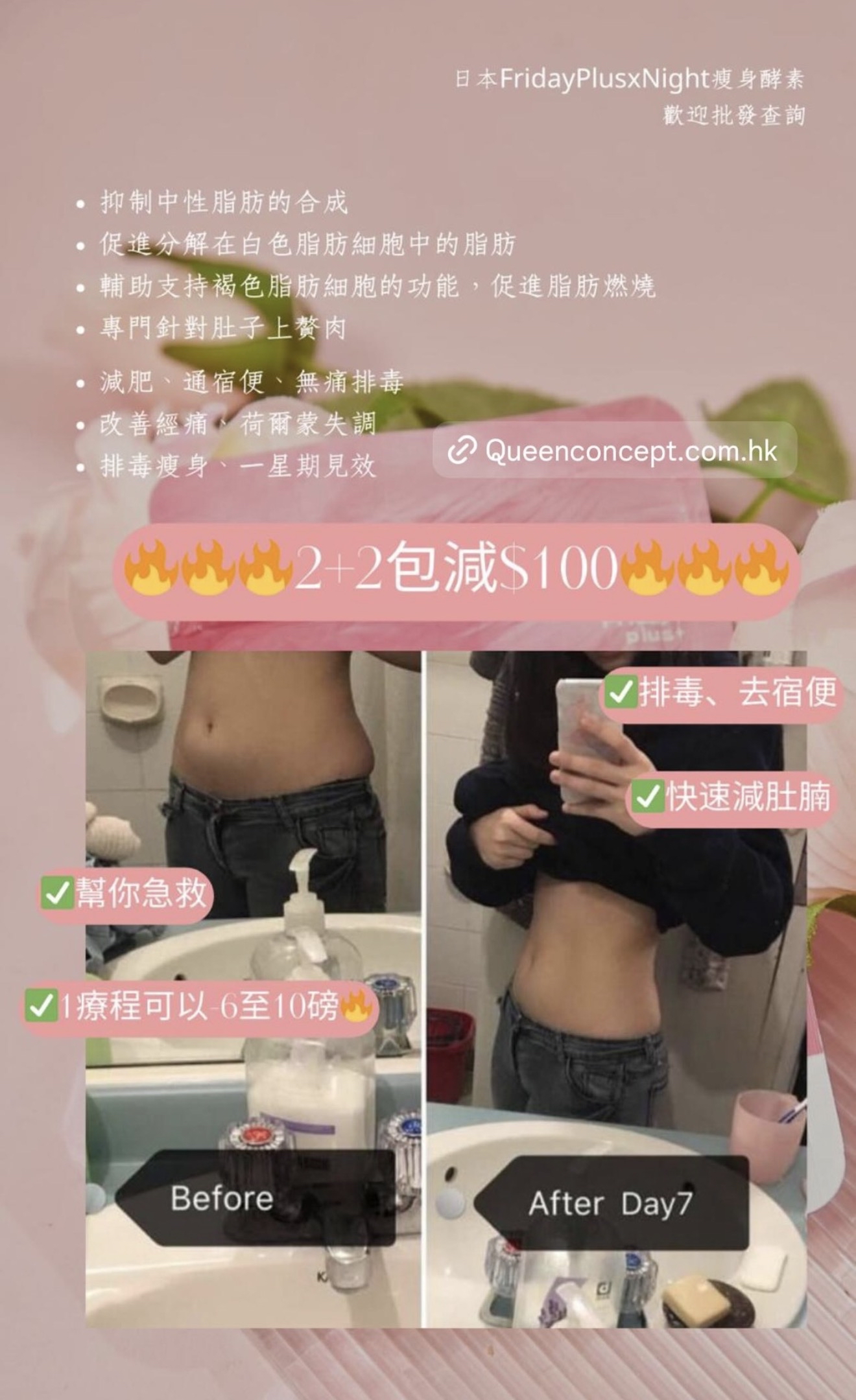 #瘋狂木木店#日本🇯🇵Friday Plus+酵素🇯🇵#日本最新出的酵素💮  供應商新價 🇯🇵日本Friday Plus + 酵素🇯🇵 一個療程可減10-20磅✨ 六包為一個療程 為期三個月🗓 一個月兩包💕 真正能調理身體兼減肥瘦身✅ 🤩🤩不依賴不反彈 無副作用🌈不影響上班去街🌈 天然成份🇯🇵日本製造🇯🇵 市面上多的是酵素,但有好多都有副作用 而家最新出既日本酵素💮Friday plus+絕對不會 ❎肚痛 ❎肚瀉 ❎標冷汗 ❎頭暈 ❎口渴 ❎無副作用 👉🏻Friday plus+ 日本酵素6大功效 1️⃣瘦身: 瘦小肚腩 啤酒肚 脂肪肚都減到 2️⃣排毒: 排清毒素 除口氣 清腸 3️⃣美顏: 祛痘 提亮膚色 4️⃣調節內分泌: 經痛 胸漲 腰酸 宮寒 月經不調 5️⃣解酒: 護肝 降三高 6️⃣平衡體內酸鹼: 不會容易病 ❌不需要減食🤫🤫❌不需要大量運動 ✨酵素成份: 天然葛花提取物🌾 葛花由來的異黃酮🌾 有效幫助減少腰腹部‼️的皮下和內臟脂肪👍🏻 有令人欣喜的作用 吃後不會有不良反應👏🏻是天然健康的輔食🌟 葛花由來的異黃酮的三個作用 1️⃣抑制中性脂肪的合成 2️⃣促進分解在白色脂肪細胞中的脂肪 3️⃣輔助支持褐色脂肪細胞的功能,促進脂肪燃燒。 4️⃣專門針對肚子上贅肉 適合人士‼️ 產後大肚,啤酒肚,久坐腰部的贅肉,吃貨的贅肉,皮下脂肪,內臟脂肪,水腫人士,男女都可服用 1包等於6包保健品,一次過解決咁多身體需要,男士都岩食😆 ✅每日早晚餐前15-20分鐘 各兩粒 就可以拉😚 ✅有時候食完飯先記得食都要補食反 ✅每曰盡量8個鐘内食哂一日所需既食物 ✅每曰3000cc水 ✅效果因體質會有所不同 適量運動效果會更加顯著❤ ✅任何一款保健產品建議食三個月或以上功效係最顯著❤ —————————————————- 日本Friday Plus+ Night (夜用版) 減肥酵素係同Friday Plus+ 做一個配搭!🤩 Friday Plus+ Night 主要有四大功效 : 🔺燃燒脂肪、加速新陳代謝 🔺提高身體消化能力、增加飽腹感 🔺消水腫 、減手手腳腳 🔺專治代謝性肥胖 🌟Friday Plus+ Night (夜用版)成份大拆解: 1. 銀杏葉 清除自由基以及抗脂質過氧化,即係令到啲脂肪唔好堆積埋一齊 2. 羅漢果 降低體內脂肪的吸收率,消水腫 3. 延命草 具延緩衰老功效,降血脂 4. 枇杷葉 促消化,提高身體的消化能力 5. 西印度櫻桃 含豐富維他命C,降低膽固醇 6. 寒天 從海藻類植物中提取的膠質,具有吸水膨漲的特性,含豐富膳食纖維,容易產生飽腹感 7. 蝦夷五加 又稱西伯利亞人蔘,係專治療代謝性肥胖 8. 寡糖 刺激腸道蠕動,防止便秘 產品份量(1包):0.4g * 60粒 (24g) ⁉️Friday Plus Night+ 常見問題: Q: 日本 Friday Plus+ Night (夜用版) 有咩用? A: Friday Plus+ Night (夜用版) 專治療代謝性肥胖。 Q: 什麼是代謝性肥胖 ? A: 代謝性肥胖指的是因為遺傳、藥物、疾病等因素,導致自身代謝功能出現異常,自身脂肪不能正常代謝分解,反而集聚在體內,從而導致肥胖。簡單來說,就是新陳代謝比較慢,而引起的胖。兩個人吃同樣的多的東西,一個45kg,一個卻65kg,是因為代謝率不一樣。 Q: Friday Plus+ Night (夜用版) 有副作用嗎? A: Friday Plus+ Night 沒有副作用,而且有齊安全食品證書 (i.e sgs),沒有西藥成分,可安全服用。 ————————————————————— 🎄聖誕🧑🏻🎄及𝟐𝟎𝟐𝟔跨年優惠開始啦✨🤓🤩 優惠日期📅: 18/11/2025 - 18/01/2026 日本減肥必👙套裝- 王牌瘦身set 💗💗日本減肚腩酵素 $1070 買𝟑送𝟏包 ✨‼️ ☑️幫你排毒、去宿便 ☑️減肚腩、胃腩、內臟脂肪 ☑️去口臭、解酒、降三高 💚💚日本去水腫丸酵母 $1070 買𝟑送𝟏包 ✨‼️ ☑️燃燒脂肪🔥加速新陳代謝💯 ☑️強效去水腫、減手腳 ☑️抑制食慾、增強飽腹感 ☑️分解糖分、油分🪔🍦🍬🍡 日本🇯🇵九州大學共同研發 - 王牌波波丸 💙日本🇯🇵BoomsUp $1560 買𝟑送𝟏包 ✨‼️ ☑️二次發育專利成份 ☑️🏀🏀🆙、養宮、幫助🏀🏀發育✨ ☑️調理經期、預防婦科疾病 ☑️補充膠原蛋白流失 🇯🇵BrightWhite美白丸 $1340 買𝟑送𝟏包 ✨‼️ 功效: 🌼法國🇫🇷專利成份 🌼美白嫩膚、對抗自由基、抗老化 🌼去黃去黑、抑制黑色素 🌼增強皮膚幼嫩度
