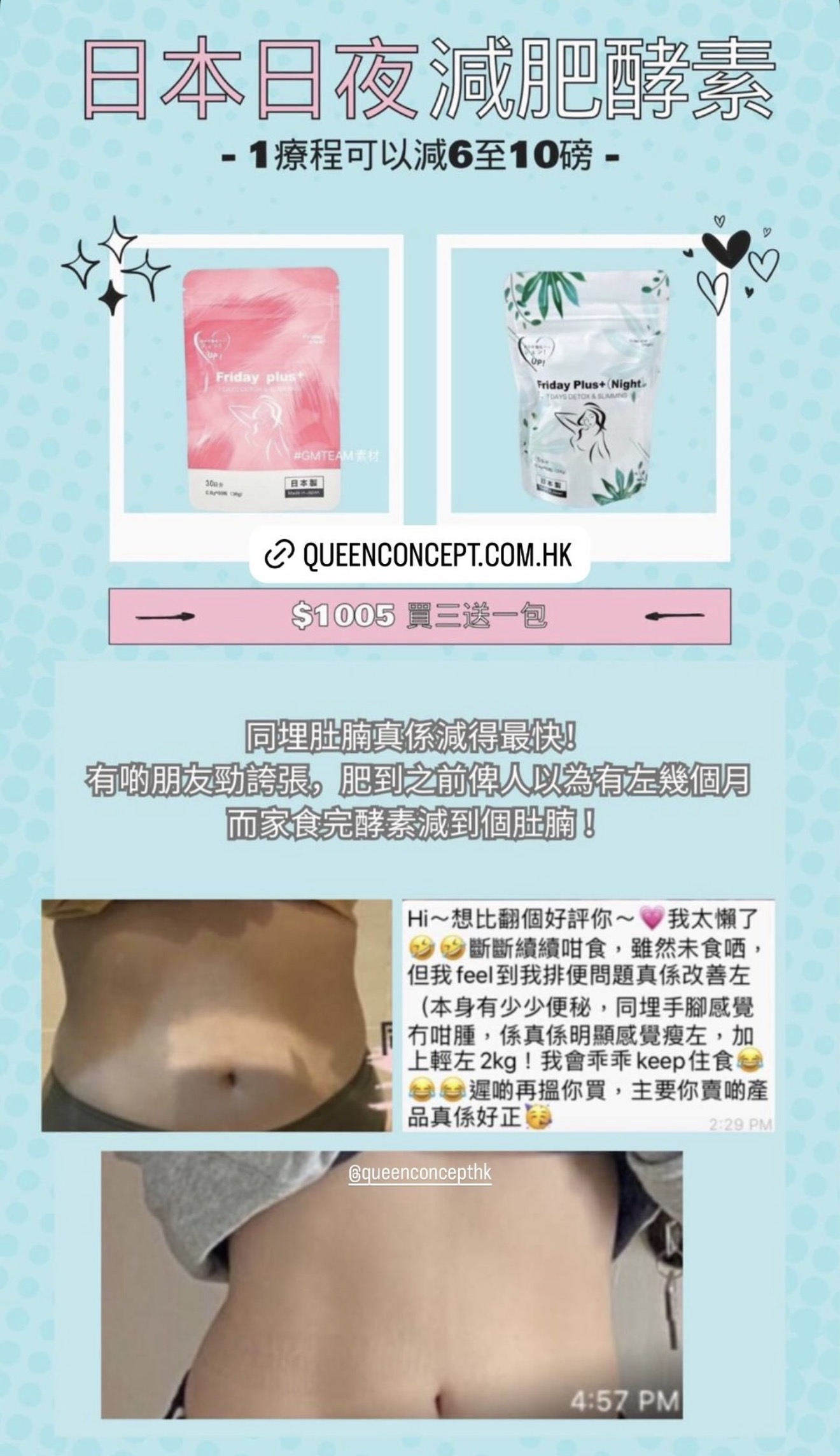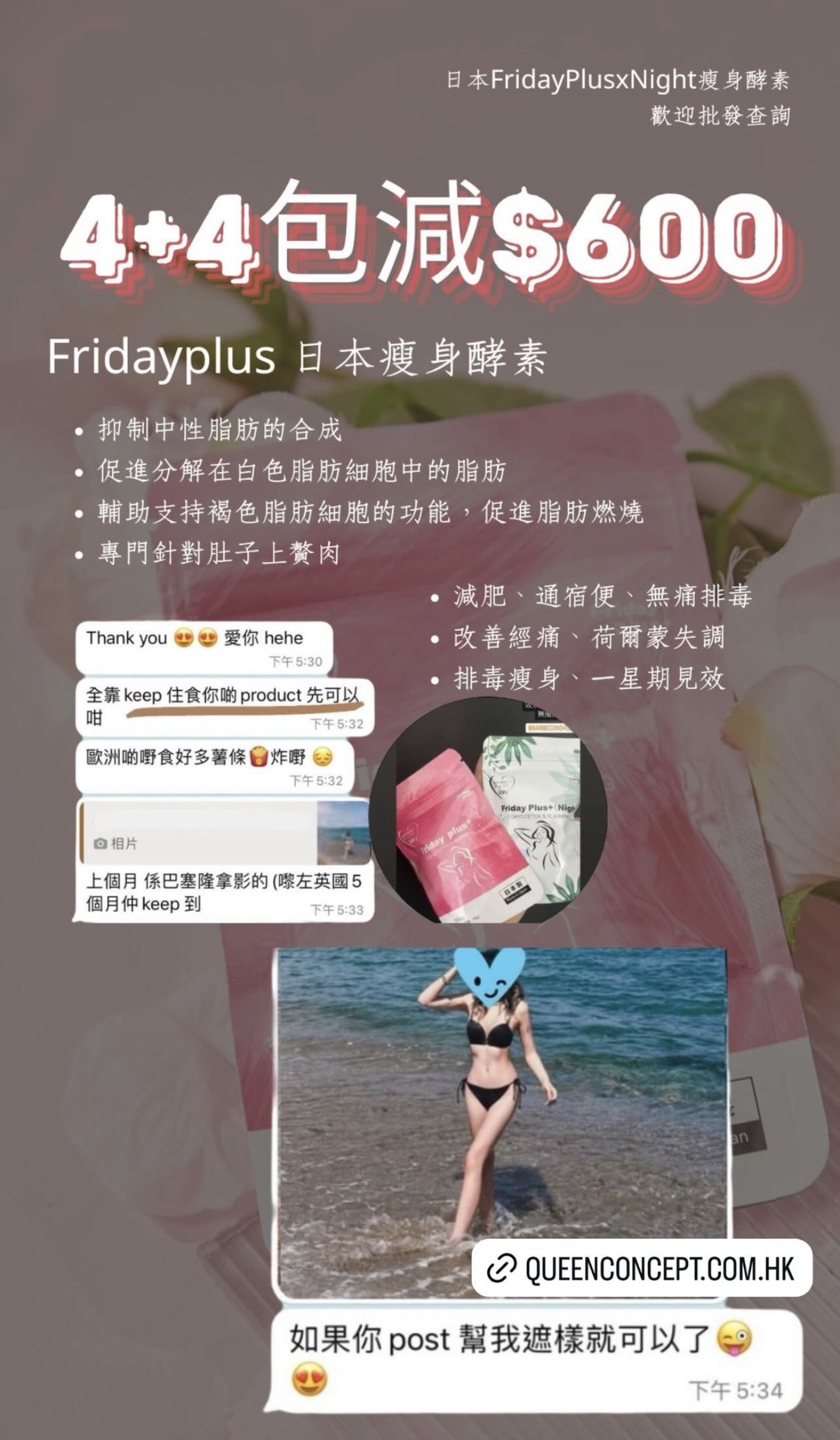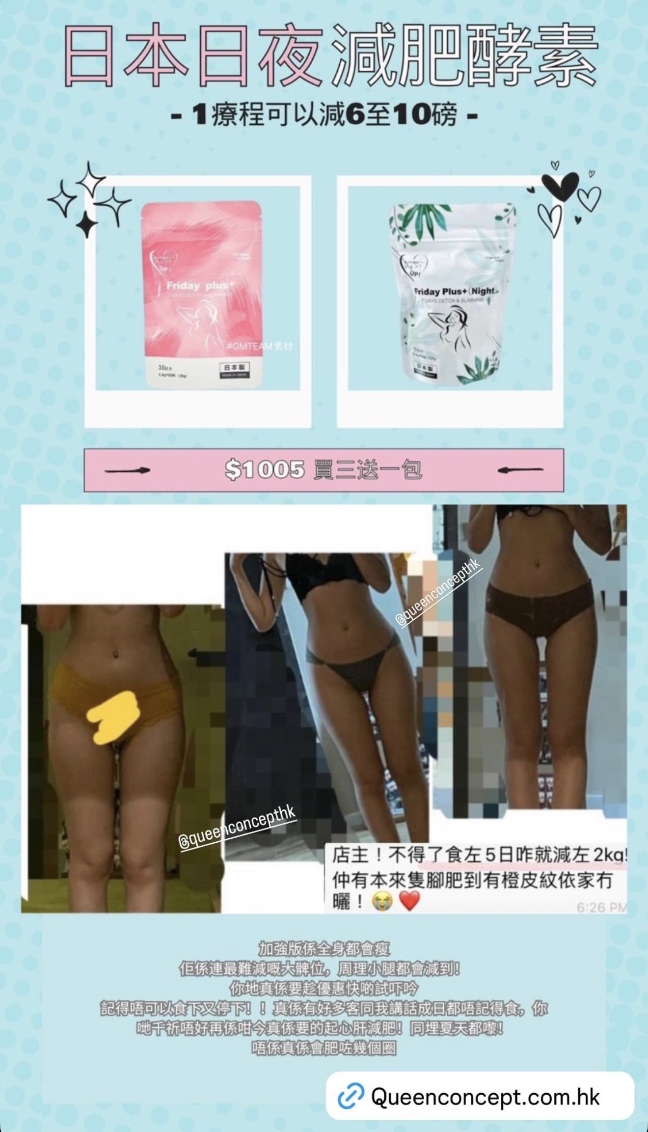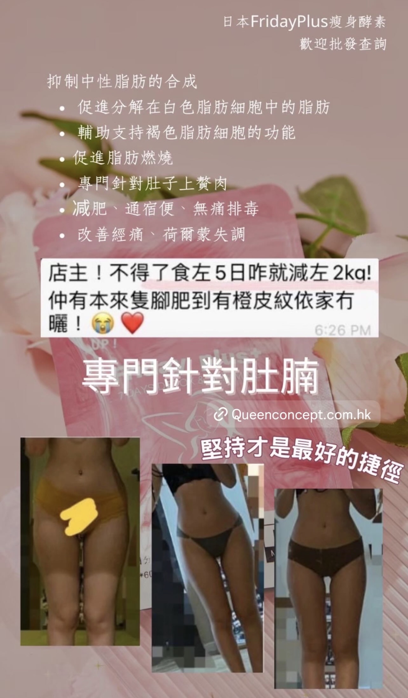 #瘋狂木木店#日本🇯🇵Friday Plus+酵素🇯🇵#日本最新出的酵素💮  供應商新價 🇯🇵日本Friday Plus + 酵素🇯🇵 一個療程可減10-20磅✨ 六包為一個療程 為期三個月🗓 一個月兩包💕 真正能調理身體兼減肥瘦身✅ 🤩🤩不依賴不反彈 無副作用🌈不影響上班去街🌈 天然成份🇯🇵日本製造🇯🇵 市面上多的是酵素,但有好多都有副作用 而家最新出既日本酵素💮Friday plus+絕對不會 ❎肚痛 ❎肚瀉 ❎標冷汗 ❎頭暈 ❎口渴 ❎無副作用 👉🏻Friday plus+ 日本酵素6大功效 1️⃣瘦身: 瘦小肚腩 啤酒肚 脂肪肚都減到 2️⃣排毒: 排清毒素 除口氣 清腸 3️⃣美顏: 祛痘 提亮膚色 4️⃣調節內分泌: 經痛 胸漲 腰酸 宮寒 月經不調 5️⃣解酒: 護肝 降三高 6️⃣平衡體內酸鹼: 不會容易病 ❌不需要減食🤫🤫❌不需要大量運動 ✨酵素成份: 天然葛花提取物🌾 葛花由來的異黃酮🌾 有效幫助減少腰腹部‼️的皮下和內臟脂肪👍🏻 有令人欣喜的作用 吃後不會有不良反應👏🏻是天然健康的輔食🌟 葛花由來的異黃酮的三個作用 1️⃣抑制中性脂肪的合成 2️⃣促進分解在白色脂肪細胞中的脂肪 3️⃣輔助支持褐色脂肪細胞的功能,促進脂肪燃燒。 4️⃣專門針對肚子上贅肉 適合人士‼️ 產後大肚,啤酒肚,久坐腰部的贅肉,吃貨的贅肉,皮下脂肪,內臟脂肪,水腫人士,男女都可服用 1包等於6包保健品,一次過解決咁多身體需要,男士都岩食😆 ✅每日早晚餐前15-20分鐘 各兩粒 就可以拉😚 ✅有時候食完飯先記得食都要補食反 ✅每曰盡量8個鐘内食哂一日所需既食物 ✅每曰3000cc水 ✅效果因體質會有所不同 適量運動效果會更加顯著❤ ✅任何一款保健產品建議食三個月或以上功效係最顯著❤ —————————————————- 日本Friday Plus+ Night (夜用版) 減肥酵素係同Friday Plus+ 做一個配搭!🤩 Friday Plus+ Night 主要有四大功效 : 🔺燃燒脂肪、加速新陳代謝 🔺提高身體消化能力、增加飽腹感 🔺消水腫 、減手手腳腳 🔺專治代謝性肥胖 🌟Friday Plus+ Night (夜用版)成份大拆解: 1. 銀杏葉 清除自由基以及抗脂質過氧化,即係令到啲脂肪唔好堆積埋一齊 2. 羅漢果 降低體內脂肪的吸收率,消水腫 3. 延命草 具延緩衰老功效,降血脂 4. 枇杷葉 促消化,提高身體的消化能力 5. 西印度櫻桃 含豐富維他命C,降低膽固醇 6. 寒天 從海藻類植物中提取的膠質,具有吸水膨漲的特性,含豐富膳食纖維,容易產生飽腹感 7. 蝦夷五加 又稱西伯利亞人蔘,係專治療代謝性肥胖 8. 寡糖 刺激腸道蠕動,防止便秘 產品份量(1包):0.4g * 60粒 (24g) ⁉️Friday Plus Night+ 常見問題: Q: 日本 Friday Plus+ Night (夜用版) 有咩用? A: Friday Plus+ Night (夜用版) 專治療代謝性肥胖。 Q: 什麼是代謝性肥胖 ? A: 代謝性肥胖指的是因為遺傳、藥物、疾病等因素,導致自身代謝功能出現異常,自身脂肪不能正常代謝分解,反而集聚在體內,從而導致肥胖。簡單來說,就是新陳代謝比較慢,而引起的胖。兩個人吃同樣的多的東西,一個45kg,一個卻65kg,是因為代謝率不一樣。 Q: Friday Plus+ Night (夜用版) 有副作用嗎? A: Friday Plus+ Night 沒有副作用,而且有齊安全食品證書 (i.e sgs),沒有西藥成分,可安全服用。 ————————————————————— 🎄聖誕🧑🏻🎄及𝟐𝟎𝟐𝟔跨年優惠開始啦✨🤓🤩 優惠日期📅: 18/11/2025 - 18/01/2026 日本減肥必👙套裝- 王牌瘦身set 💗💗日本減肚腩酵素 $1070 買𝟑送𝟏包 ✨‼️ ☑️幫你排毒、去宿便 ☑️減肚腩、胃腩、內臟脂肪 ☑️去口臭、解酒、降三高 💚💚日本去水腫丸酵母 $1070 買𝟑送𝟏包 ✨‼️ ☑️燃燒脂肪🔥加速新陳代謝💯 ☑️強效去水腫、減手腳 ☑️抑制食慾、增強飽腹感 ☑️分解糖分、油分🪔🍦🍬🍡 日本🇯🇵九州大學共同研發 - 王牌波波丸 💙日本🇯🇵BoomsUp $1560 買𝟑送𝟏包 ✨‼️ ☑️二次發育專利成份 ☑️🏀🏀🆙、養宮、幫助🏀🏀發育✨ ☑️調理經期、預防婦科疾病 ☑️補充膠原蛋白流失 🇯🇵BrightWhite美白丸 $1340 買𝟑送𝟏包 ✨‼️ 功效: 🌼法國🇫🇷專利成份 🌼美白嫩膚、對抗自由基、抗老化 🌼去黃去黑、抑制黑色素 🌼增強皮膚幼嫩度